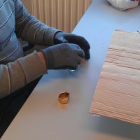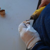 - Kraag opschuren. Onderaan het langste gedeelte op het verzonken gedeelte. Plaats de schuurmachine zo vlak mogelijk op de kraag en schuur het voorzichtig op tot men geel ziet. Het moet voldoende groot zijn voor de druppel lijm.